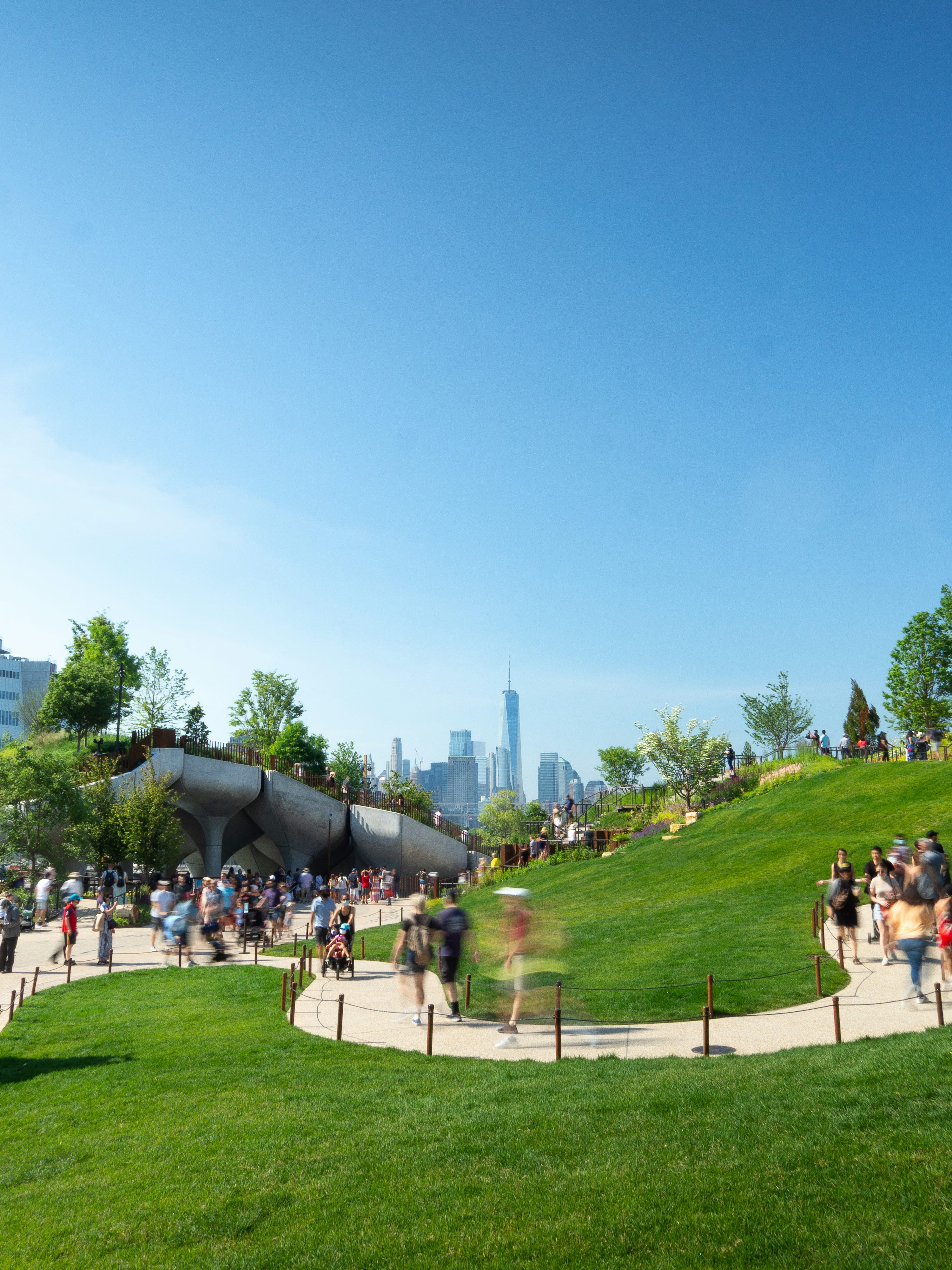 Little Island의 가장 높은 지점에 올라가면 맨해튼 스카이라인과 허드슨 강의 환상적인 전망을 감상할 수 있어요. 특히 일몰 시간에 방문하면 황금빛으로 물드는 도시의 모습을 배경으로 인생샷을 건질 수 있답니다!