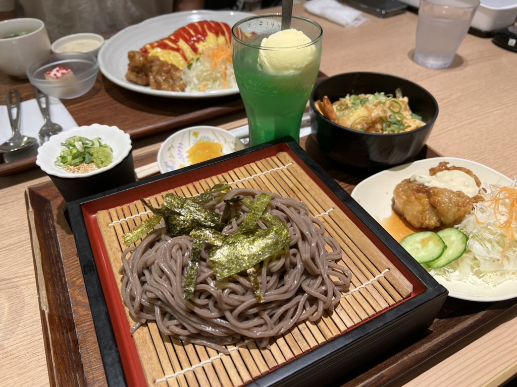 저는 소바 정식, 오므라이스 정식, 그리고 메론 소다를 시켰습니다.