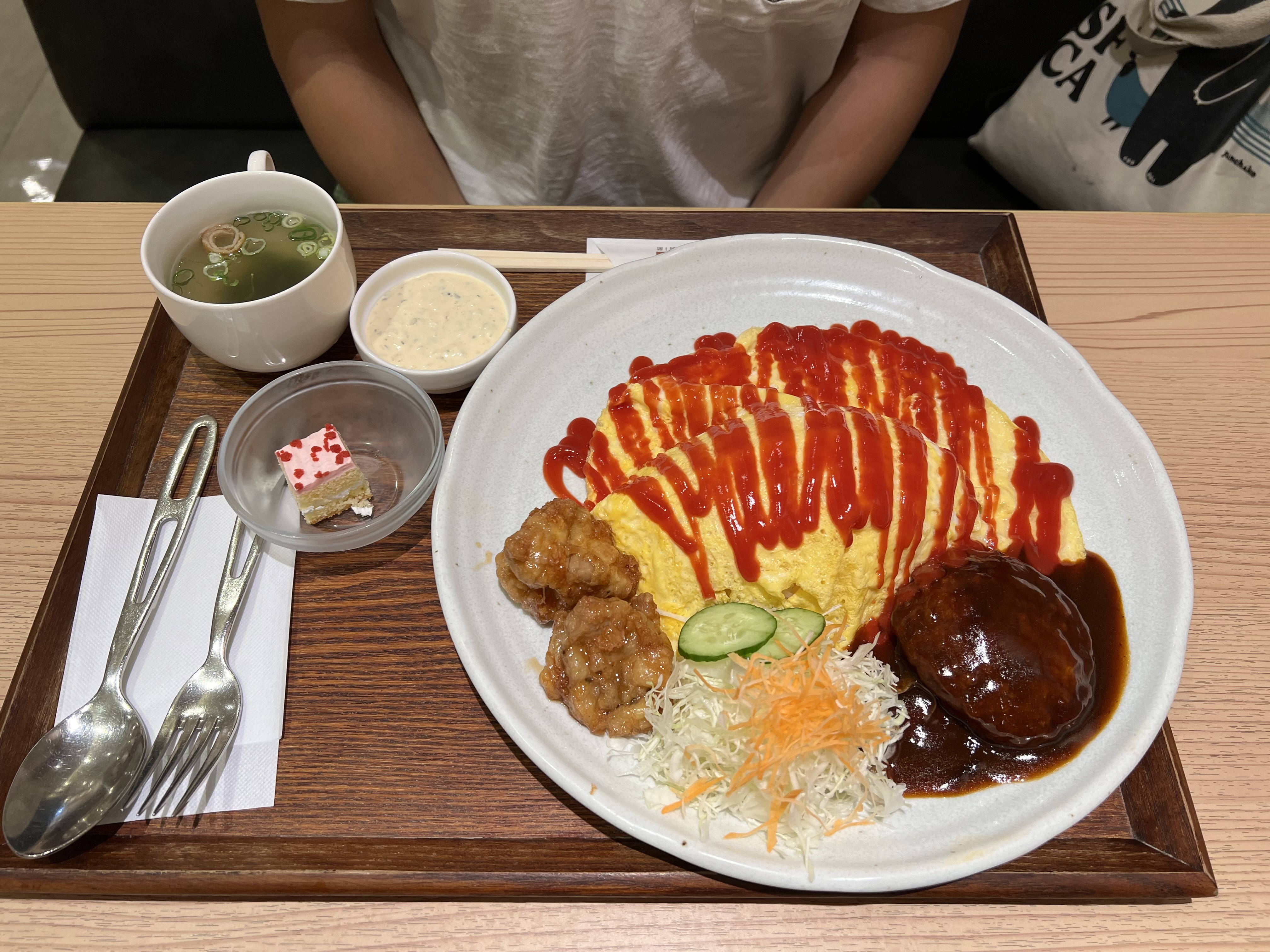 오므라이스 정식은 부드러운 계란과 잘 익은 밥이 정말 잘 어울렸고, 같이 나온 함바그와 치킨까지 더해지니 맛이 풍성해 너무 만족했습니다. 미소시루에 작은 케익 디저트까지 나와서 배가 든든했습니다.