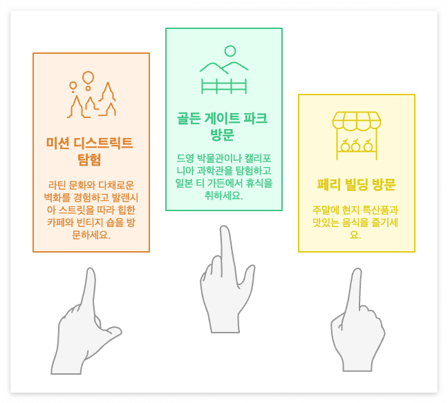 3일 일정이라면 앞서 소개한 1박 2일 코스에 더해 좀 더 깊이 있는 샌프란시스코 여행이 가능해집니다. 셋째 날은 미션 디스트릭트에서 시작해보세요. 이곳은 라틴 문화의 영향을 받은 지역으로 다채로운 벽화와 독특한 분위기가 매력적입니다. 특히 발렌시아 스트릿을 따라 걸으며 힙한 카페와 빈티지 숍들을 구경하는 재미가 쏠쏠해요.