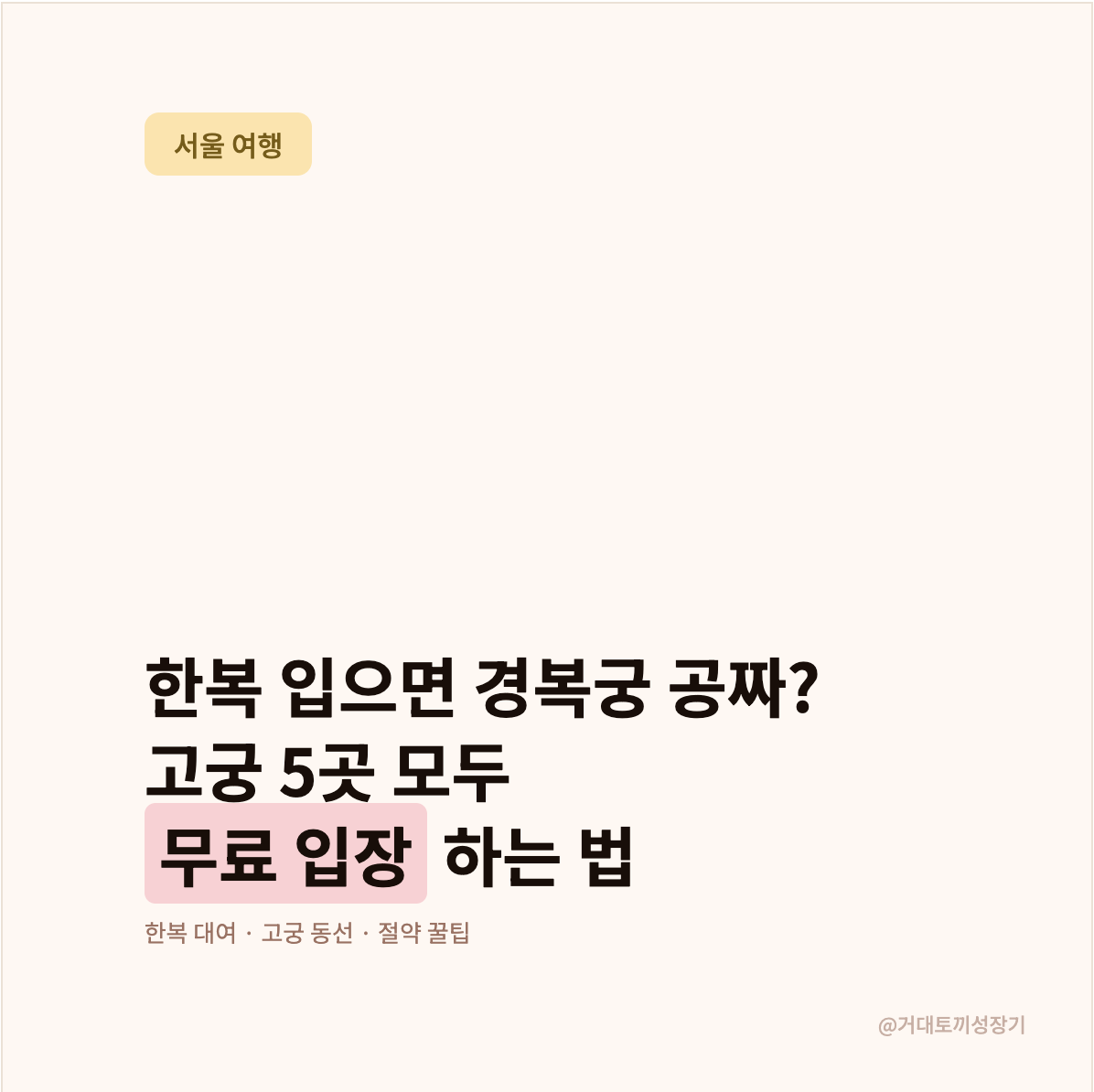 한복만 제대로 갖춰 입으면 서울 주요 고궁 전부를 무료로 즐길 수 있어요. 경복궁, 창덕궁, 창경궁, 덕수궁, 종묘까지, 한복 한 벌이면 수만 원 절약이에요.