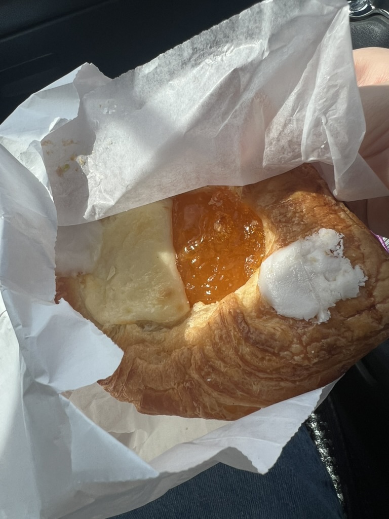 제가 고른 빵은 바로 Cream Cheese Apricot Danish입니다. 겹겹이 층을 이룬 바삭한 페이스트리는 입에 넣는 순간 바삭하게 부서지며 버터의 풍미를 선사합니다. 어쩜 이렇게 겉에는 크리스피하고 치즈와 살구잼이 잘 어우러지는지.. 감탄하며 와구와구 먹었습니다😋