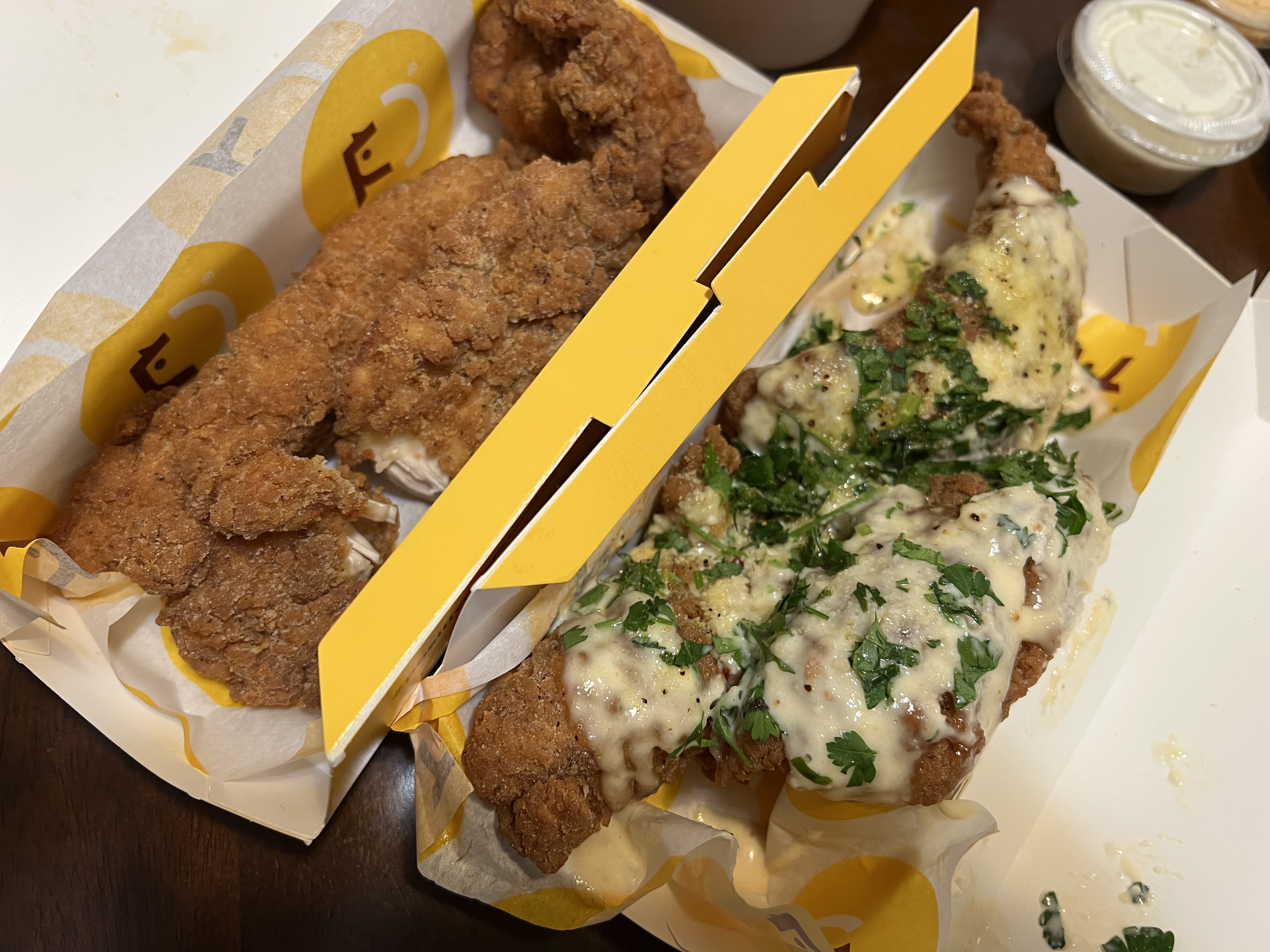 둘 다 무뼈 치킨이었는데, 클래식 텐더는 바삭하면서도 육즙이 살아있어 맛있었지만, 레몬 갈릭 텐더는 레몬 맛이 너무 강해서 다소 셌어요. 솔직히 전체적으로 좀 짠 느낌이 있었습니다.