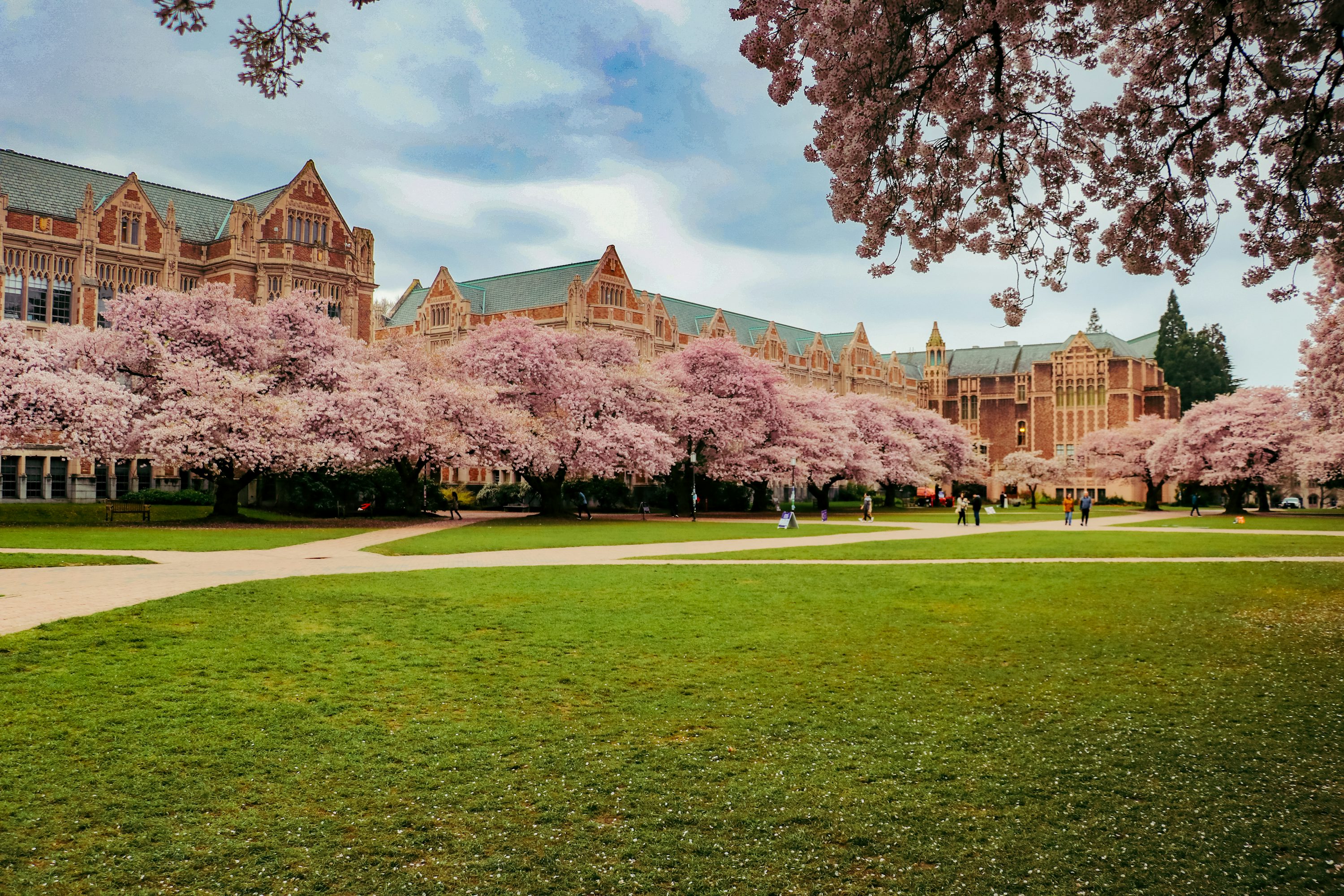 워싱턴 대학교(University of Washington)는 벚꽃 명소로 유명합니다. 4월 초~중순 쿼드(The Quad)에 30그루의 요시노 벚나무가 만개해요. 고딕 양식의 수잔 도서관은 해리포터 촬영지 같은 분위기를 자랑합니다.