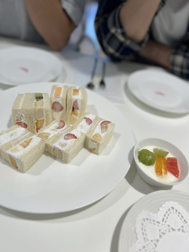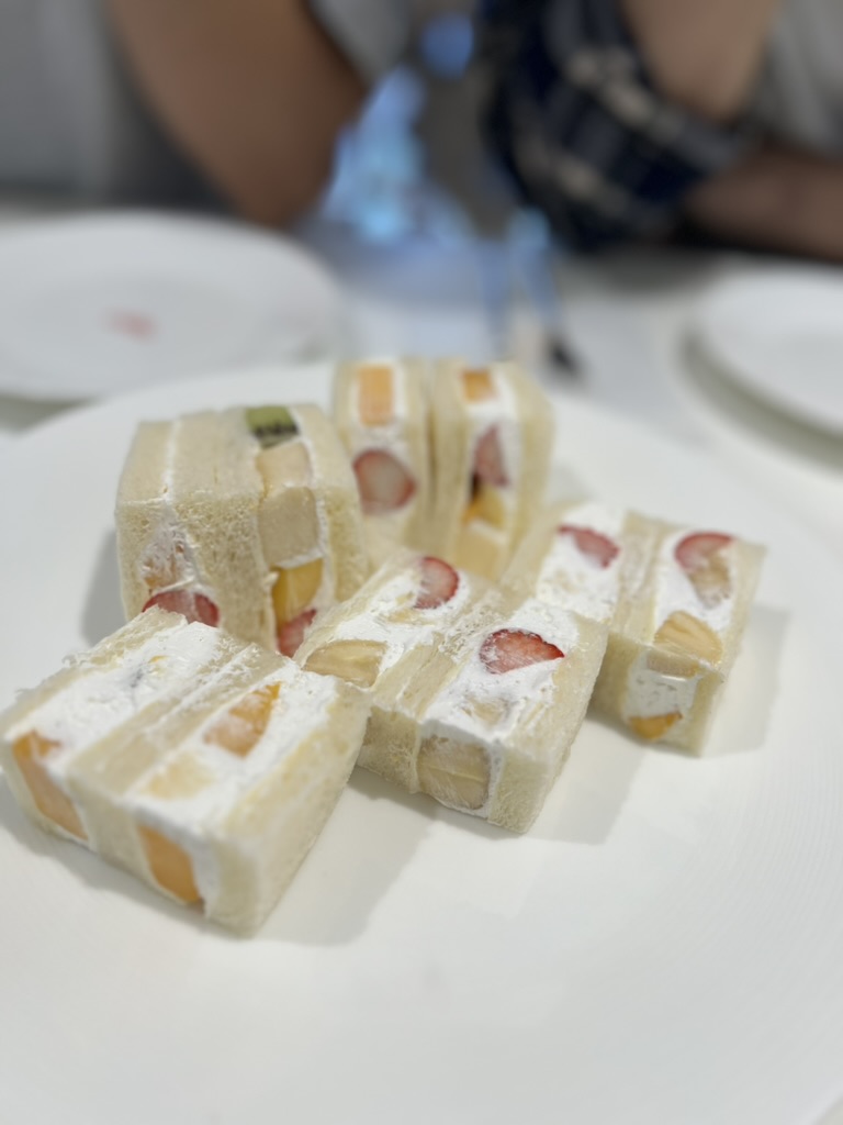 가족과 함께 신주쿠의 Takano Fruits Parlor 본점을 방문했을 때, 우리는 다양한 메뉴를 시켜보며 그 맛을 하나하나 즐길 수 있었습니다. 총 4명이 방문하여 각자 다른 메뉴를 선택했는데, 처음으로 나온 것은 바로 과일 샌드위치였습니다.