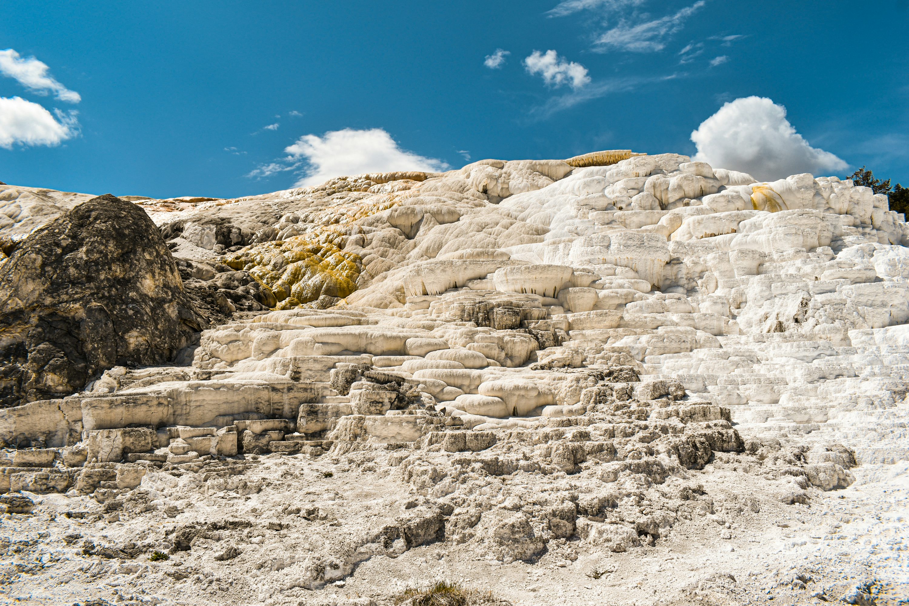 Lower Terraces에서 가장 인상적인 곳이에요. 하얀 석회암 계단이 층층이 쌓인 모습이 마치 터키의 파묵칼레를 연상시켜요. 활동적인 온천이라 물이 흐르는 모습을 직접 볼 수 있고, 테라스 위로 수증기가 피어오르는 장면은 정말 장관이에요.