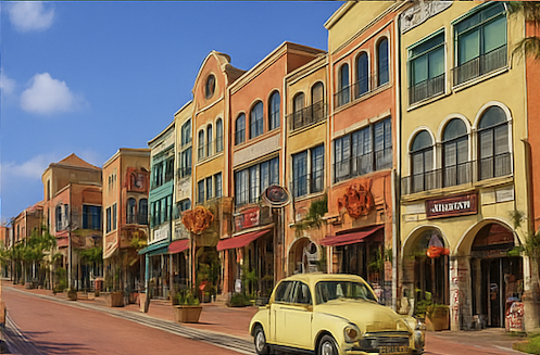 아메리칸빌리지에 들어서면 마치 미국의 작은 도시에 온 것 같은 느낌을 받게 됩니다. 알록달록한 건물들, 넓은 도로, 그리고 대형 간판들이 미국적인 분위기를 물씬 풍기죠. 이곳의 랜드마크인 58번 국도 주변의 컬러풀한 건물들과 대형 관람차는 인스타그램에서 인기 있는 포토스팟이기도 합니다.