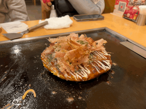 모든 오코노미야키는 기본적으로 양배추와 다양한 재료가 들어가서 건강식이라는 생각이 들었습니다. 바삭한 겉과 부드러운 속이 조화를 잘 이루고, 그 위에 얹혀진 가쓰오부시와 특제 소스가 풍미를 더 줍니다. 그리고 특히 오코노미야키가 조리되는 과정을 바로 앞에서 보는 것도 재밌었습니다.
