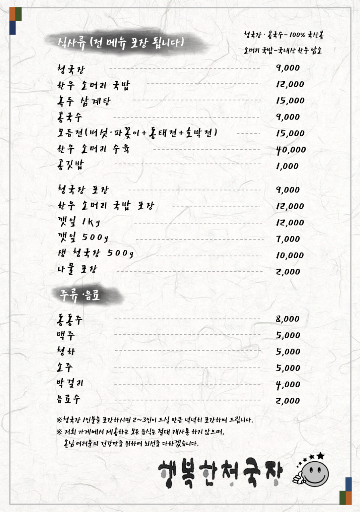 메뉴판은 위와 같습니다. 저희가 갔을 땐 콩국수 시즌이 막 끝났던 때라 콩국수도 시키고 싶었지만, 못 시키고 청국장과 모듬전을 시켰습니다.