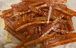 한국에서는 '오징어채볶음(ojingeochae bokkeum)'이라고 부르며, 말린 오징어를 고추장 양념에 볶아서 만들어요. 하지만 하와이의 Taegu는 볶지 않고 그냥 양념에 버무려서 재워둡니다. 이게 가장 큰 차이점이죠! 조리 과정이 훨씬 간단해서 하와이 사람들이 더 쉽게 즐길 수 있게 변형된 거예요.