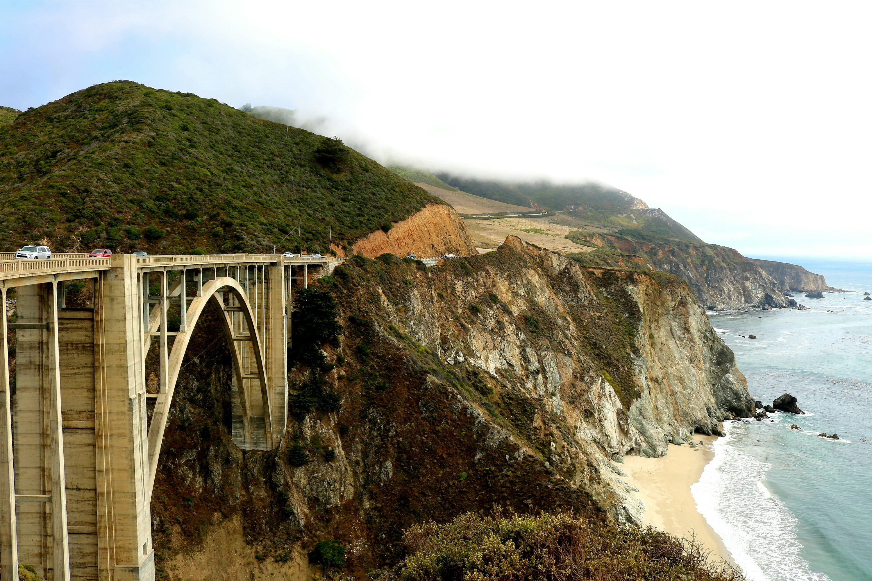 - 빅스비 브리지(Bixby Bridge): 인스타그램에서 가장 많이 볼 수 있는 바로 그 다리! 1932년 완공된 이 아치형 다리는 높이 85m로, 태평양 위를 가로지르는 모습이 장관입니다.
