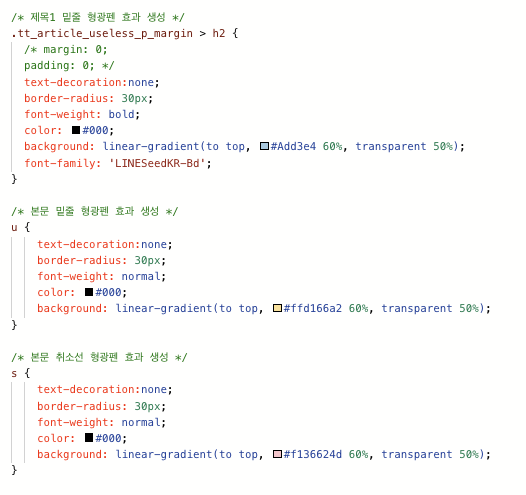⚠️ 개발자 도구를 보면 아시겠지만, <u>, <s> 등 각 문장의 스타일마다 다르기 때문에 본인이 형광펜 치고 싶은 단락/문장/단어마다 확인해주세요!