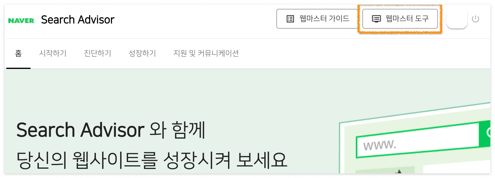 2️⃣ 로그인 후 상단의 '웹마스터 도구' 메뉴로 이동합니다.