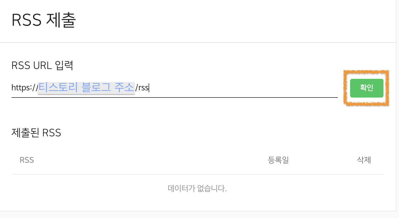 5️⃣ 본인 티스토리 주소 뒤에 /rss (소문자로) 입력 후 확인 클릭