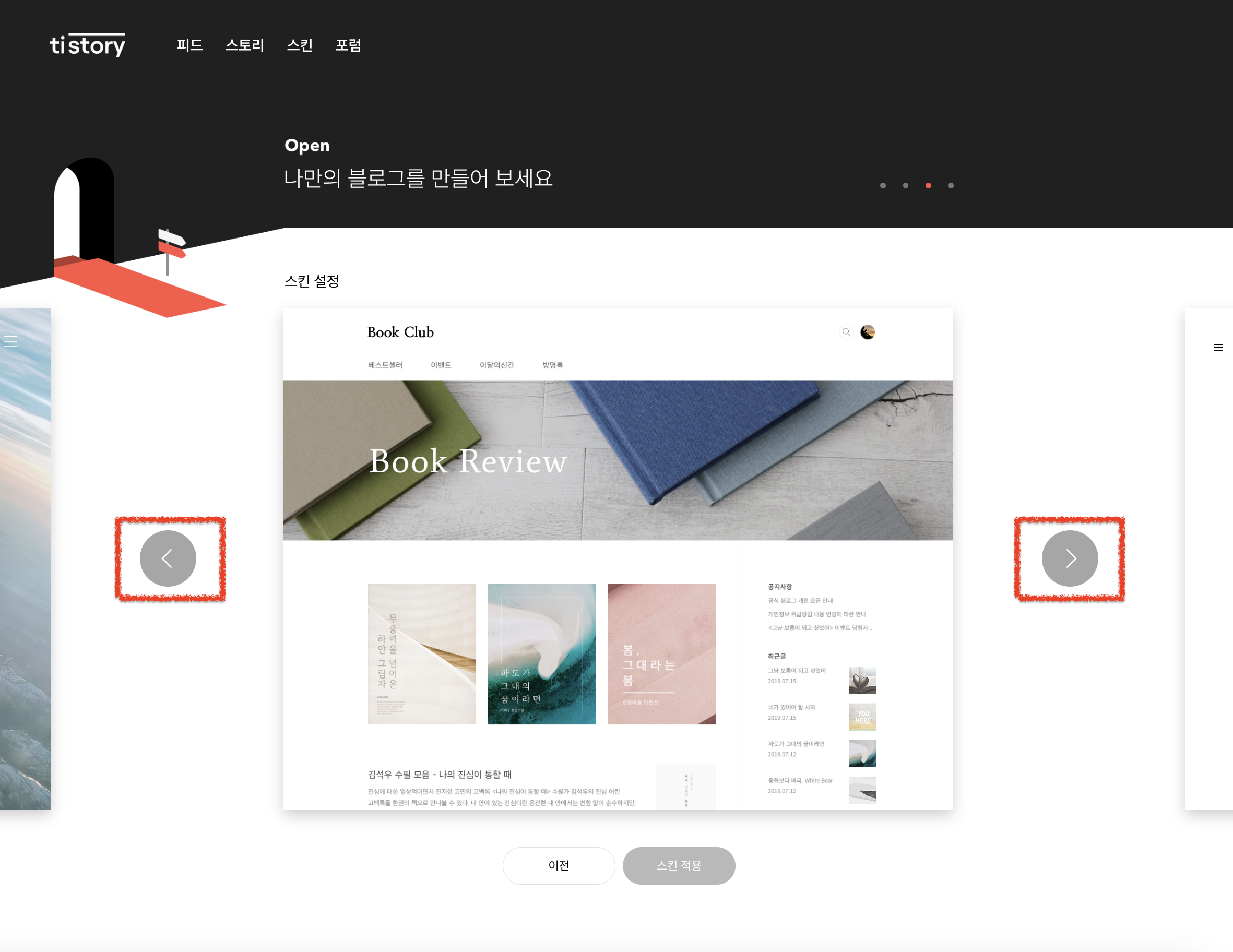 이제 본인의 블로그를 만들기 위한 스킨을 선택할 수 있습니다. 옆에 화살표를 클릭하며 원하는 스킨을 선택합니다.