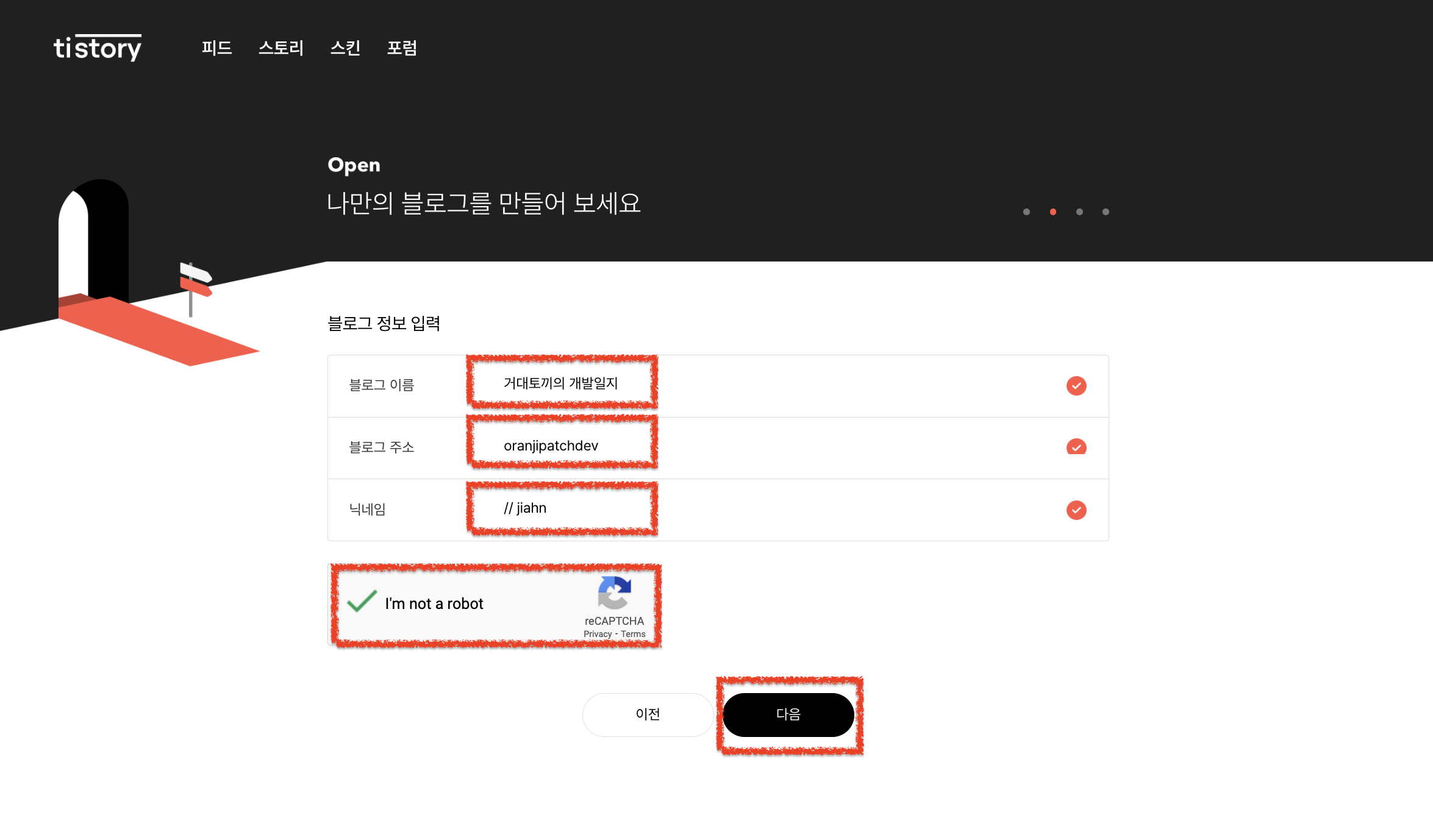 블로그 이름, 블로그 주소, 그리고 닉네임을 설정합니다.