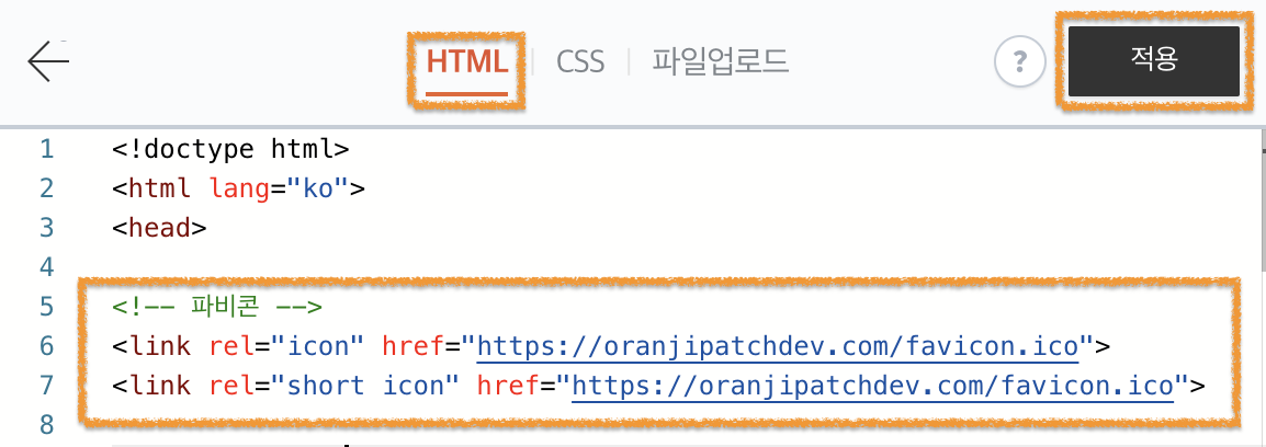 5️⃣ HTML 클릭 후 복사한 파비콘 주소를 붙여넣기
