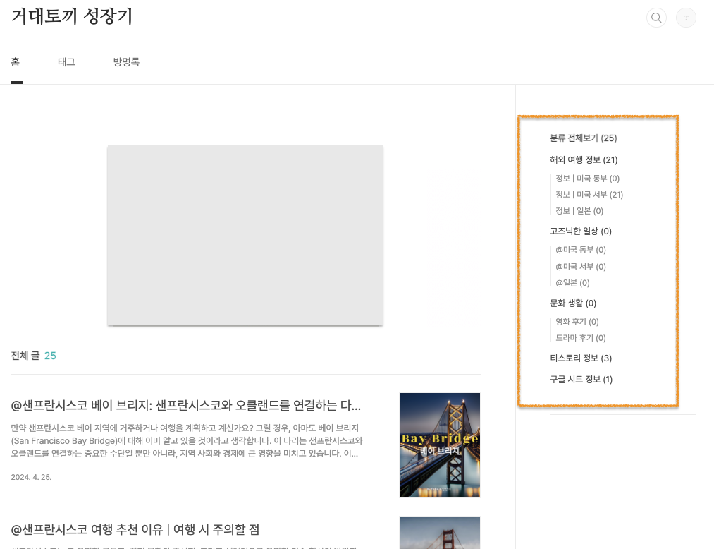 다양한 주제의 글들을 관련된 카테고리로 분류하고, 사이드바를 통해 블로그를 방문해 주시는 분들께 더욱 쉽게 원하는 주제를 선택하여 관련 글을 볼 수 있도록 설정해 보세요!ㅎㅎ
