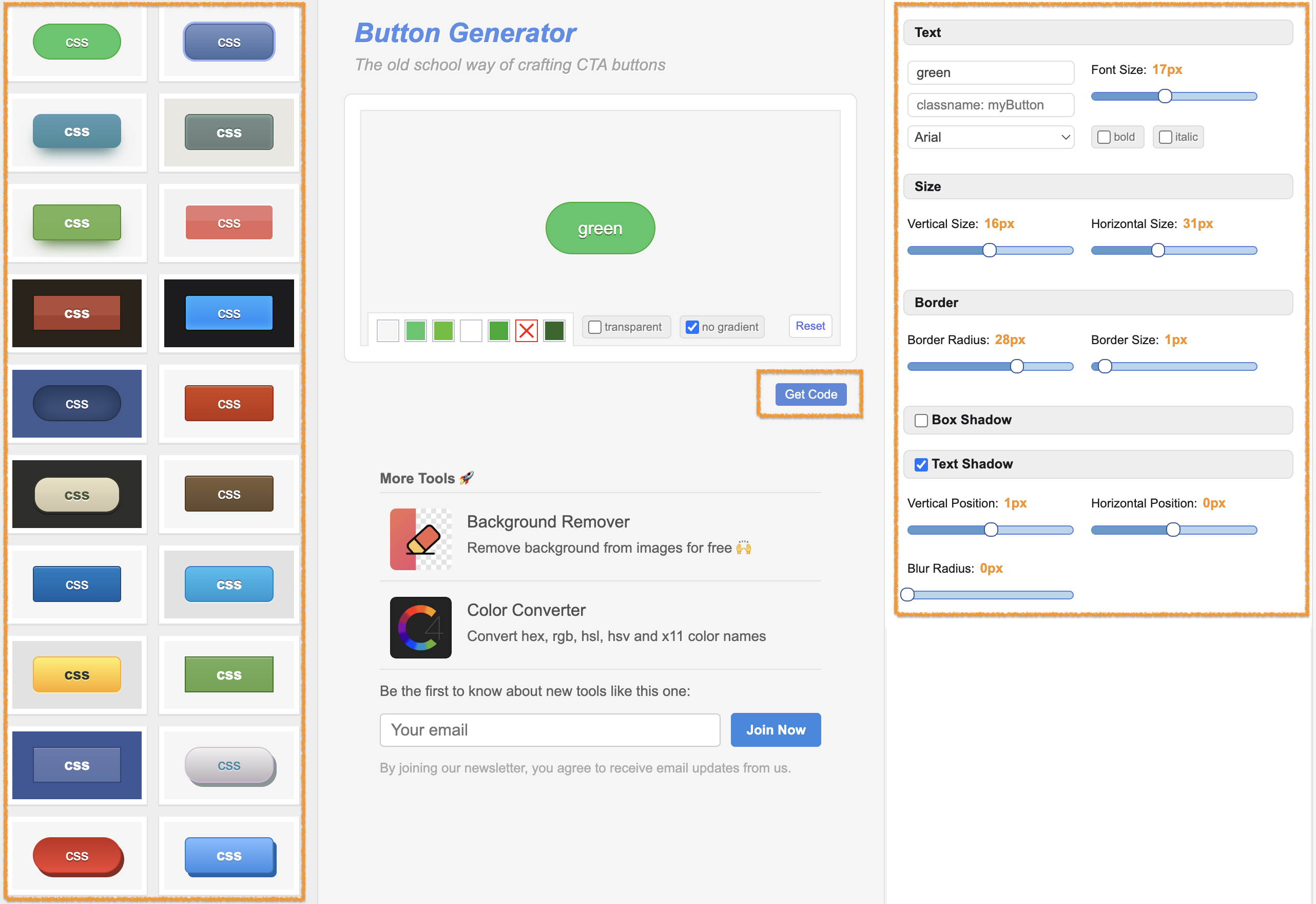 변경을 완료한 후에 가운데에 있는 Get Code를 클릭해서 버튼의 코드 생성