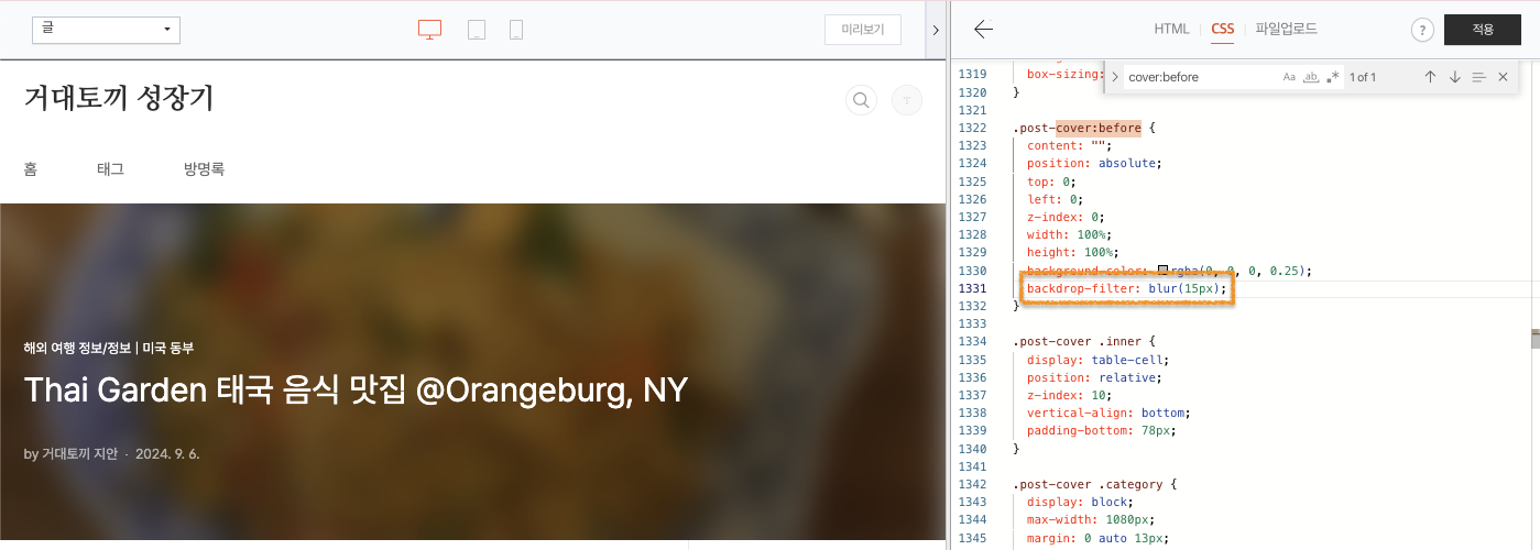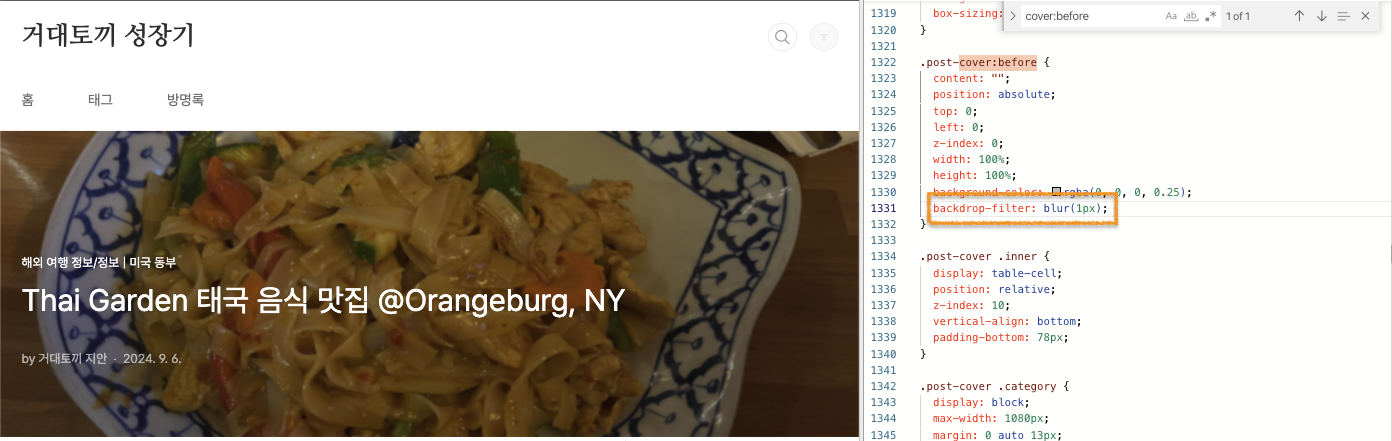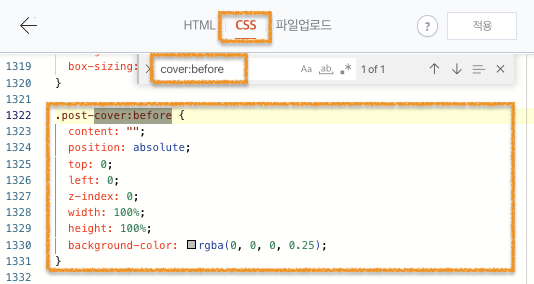 3️⃣ css > ctrl+f 로 cover:before 검색해서 .post-cover:before 찾기
