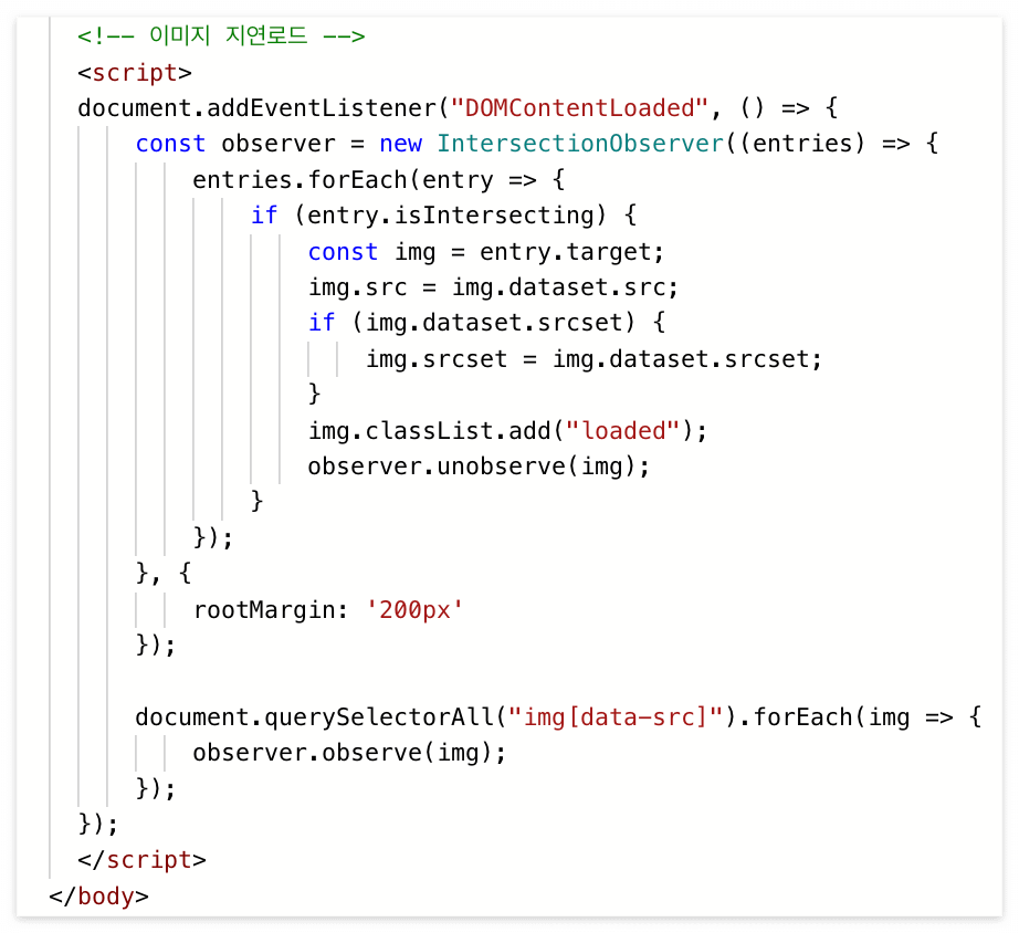 예를 들어봅시다. 블로그 글을 작성했을 때 긴 글에 많은 이미지가 포함되어 있다면, 모든 이미지를 한 번에 로드하면 시간이 오래 걸릴 수 있습니다. 하지만 이미지 지연 로드를 사용하면 사용자가 스크롤을 내려서 이미지를 볼 때마다 그때그때 로드되므로 더 빠르게 페이지가 표시됩니다.