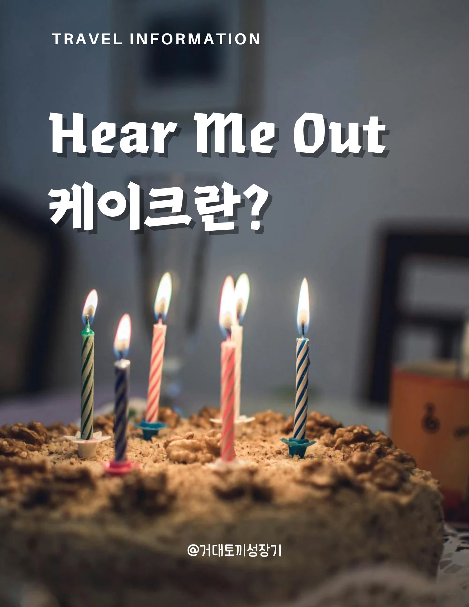 'Hear Me Out 케이크'는 자신의 독특하거나 일반적이지 않은 유명인 또는 캐릭터에 대한 크러시(짝사랑)를 친구들에게 공개하는 소셜 트렌드예요. 영어로 "Hear me out"은 "내 말 좀 들어봐" 또는 "이상하게 들릴 수 있지만 한번 들어봐"라는 의미를 가지고 있죠.